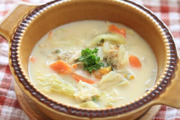 ひと煮立ちしたら、豆乳100ccとコンソメ1個を加え、塩コショウで味を調えたらできあがり。