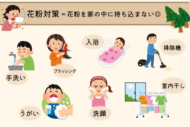 玄関に入る前に、服や髪についた花粉を払い落とし、室内に花粉を持ち込まないようにします。